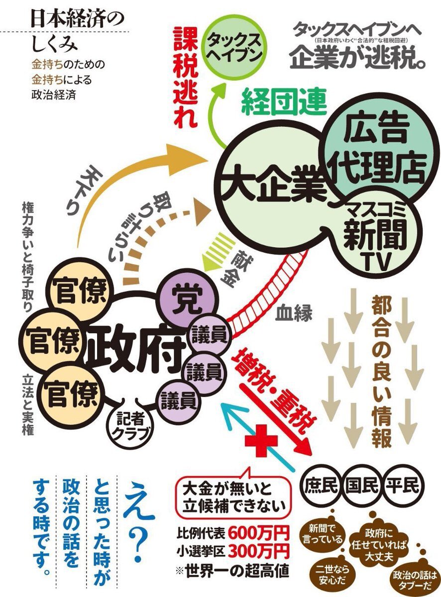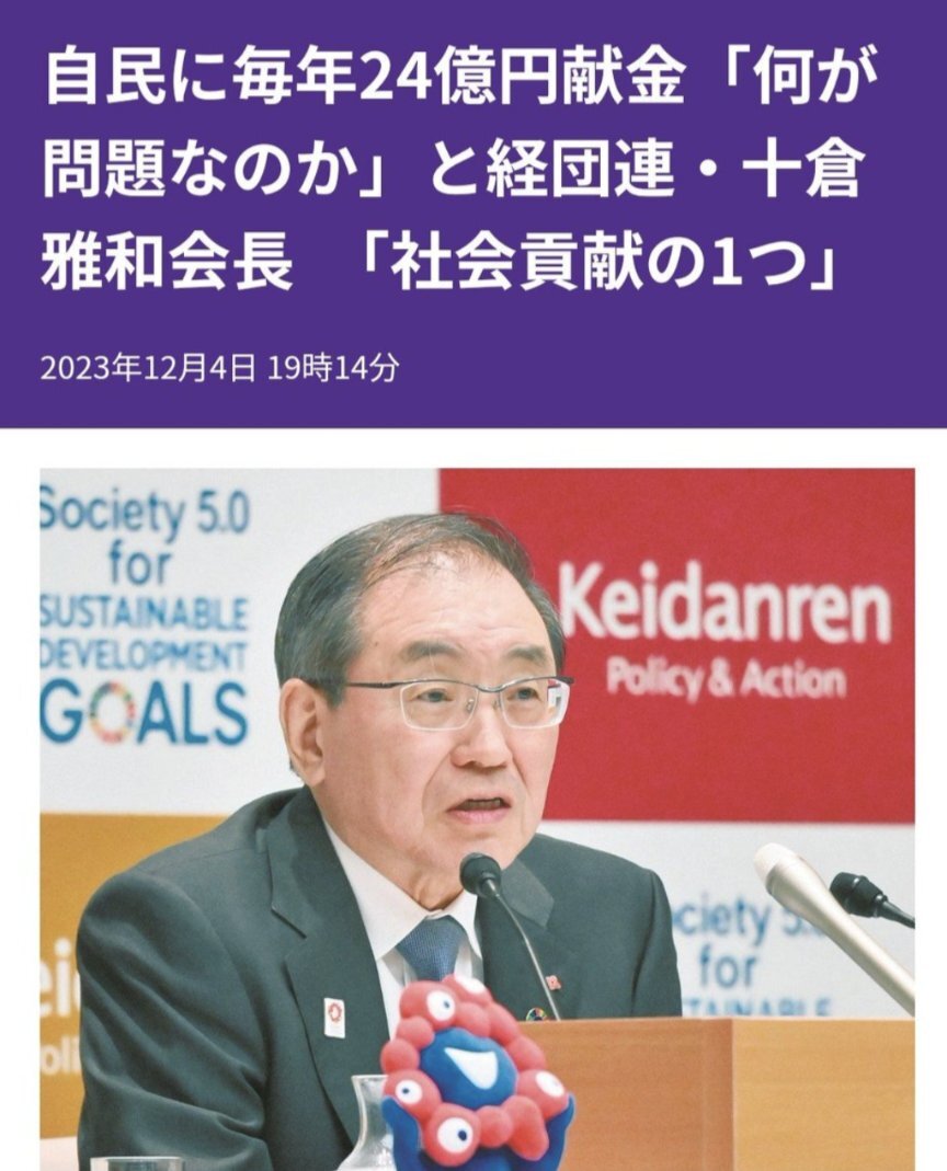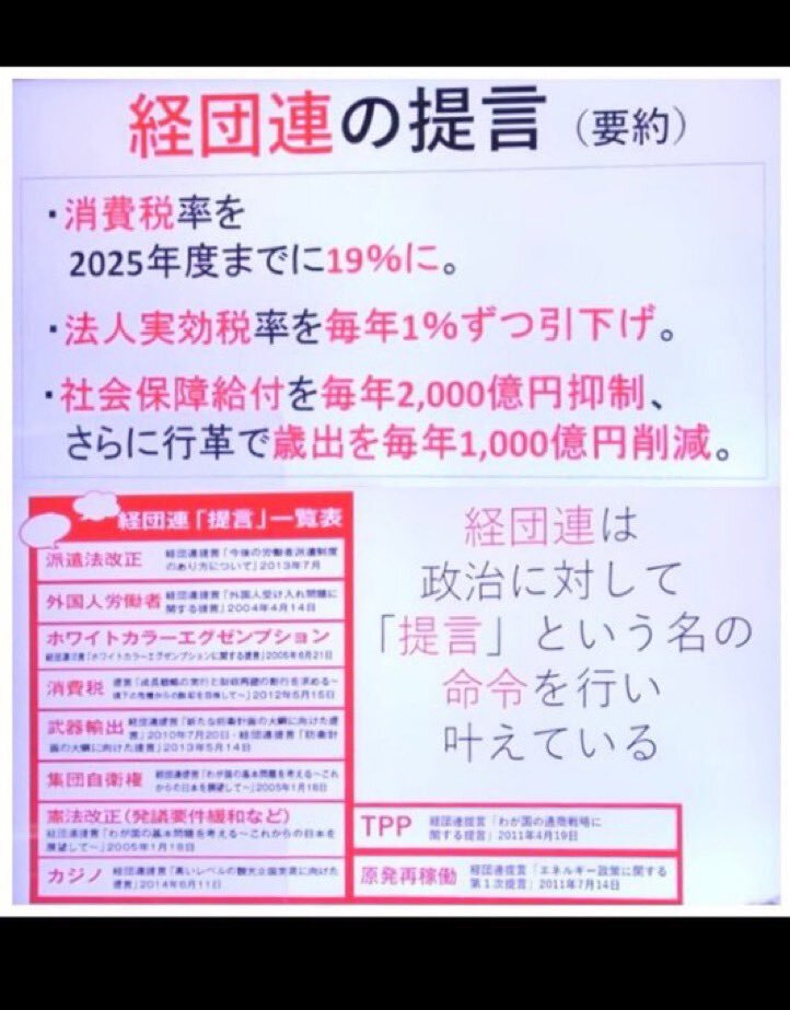 返信先:@toto_0921#史上最大の国家汚職 経団連が企業団体を登録した連合‼️ 経団連が自民党に政策提言(命令)そしてそれを時間をかけて実行する自民党‼️ 数億円の賄賂(献金)と組織票を餌に法人税減税‼️ 社会貢献?経団連の法人税増税すれば良い‼️ まさに汚職国家です‼️ #消費税は特殊詐欺税 @jimin_koho @keidanren pic.x.com/tE49koCXsq
