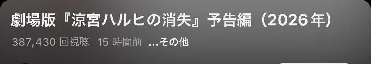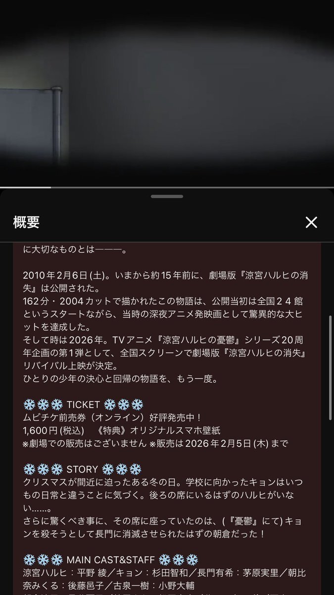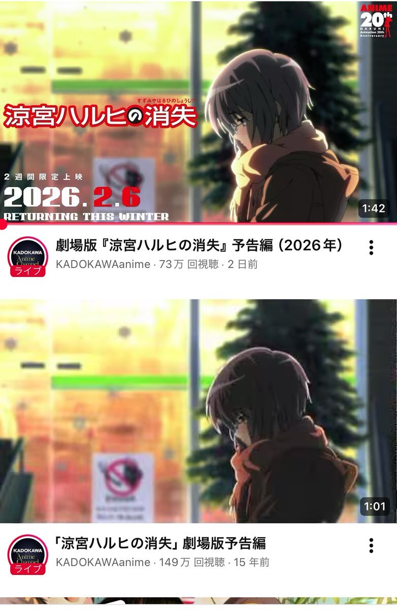 #ハルヒ oricon.co.jp/news/2418625/p… 『#涼宮ハルヒの憂鬱』放送20周年企画 劇場版『#涼宮ハルヒの消失』16年ぶりに来年2月に再上映 原作者のお気持ちコメント全文 2025/11/14 2026年2月6日より16年ぶりに全国で上映開始となり、このリバイバル上映にあわせて新規制作された予告映像も解禁となった。