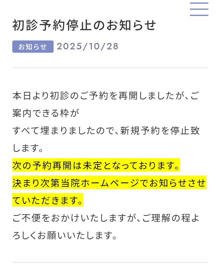 おはようございます😊 本日の西浦クリニックは、夜診までの一日です👨‍⚕ 【初診ご予約停止のお知らせ】 昨日で予定しておりました初診の方のご予約枠が全て埋まりました。次回の予約再開はホームページにてお知らせいたします。 #西浦クリニック #淀川区精神科 #淀川区心療内科 #初診 #予約停止 pic.x.com/f1njdE8gCJ