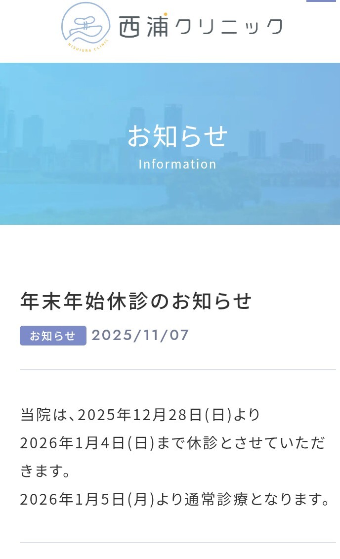 おはようございます😊 本日の西浦クリニックは、夜診までの一日です👨‍⚕ 【年末年始 休診のお知らせ】 少し早めですが、年末年始休診のお知らせをホームページでお知らせしています。皆さま、ご確認をよろしくお願いします🙇 #西浦クリニック #淀川区精神科 #淀川区心療内科 #休診 #年末年始 pic.x.com/rzhaqVvKfd