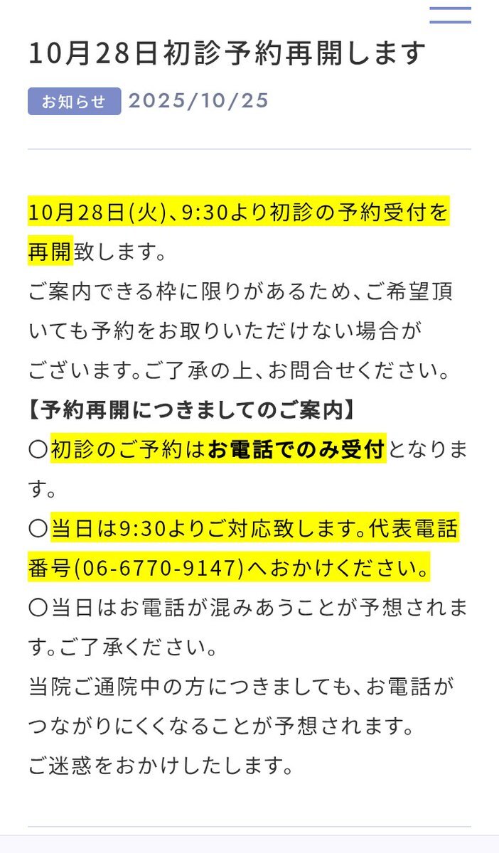 おはようございます😊本日の西浦クリニックは、一日診療となっております👨‍⚕ 【初診ご予約再開のおしらせ】 明日10/28火曜日より、初診ご予約を再開します。ご予約はお電話でのみ受付させて頂きます。 詳細はホームページをご確認ください。 #西浦クリニック #淀川区精神科 #淀川区心療内科 #初診 pic.x.com/0SZjYR8NEz