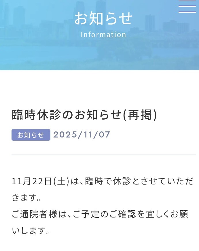おはようございます😊 本日の西浦クリニックは、午前診療となっております👨‍⚕ 【休診のお知らせ】 11/22(土)は、休診とさせて頂きます。当院ご利用中の皆さまはご予定の確認をよろしくお願いします🙇 #西浦クリニック #淀川区精神科 #淀川区心療内科 #診療時間 #休診 pic.x.com/LVs2saClkw