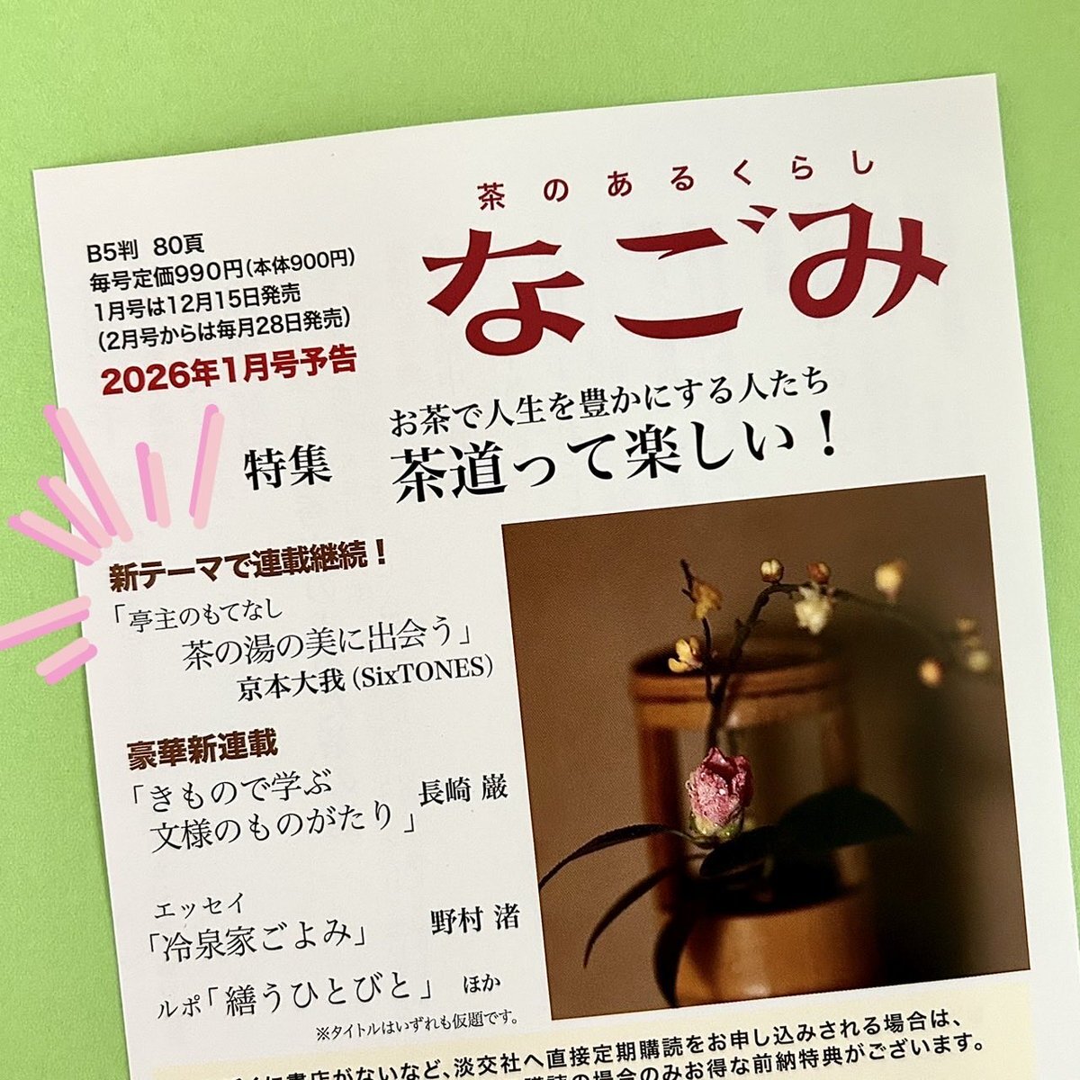 #京本大我亭主のもてなし 来年も継続🙌 #月刊誌なごみ さん、 #淡交社 さん、本当にありがとうございます🙇‍♀️!! 毎月 美しさ麗しさと共に、自分の知らない世界を知れるのが楽しいです☺️ 来年もよろしくお願いします~🍵 x.com/tankosha_bs/st…