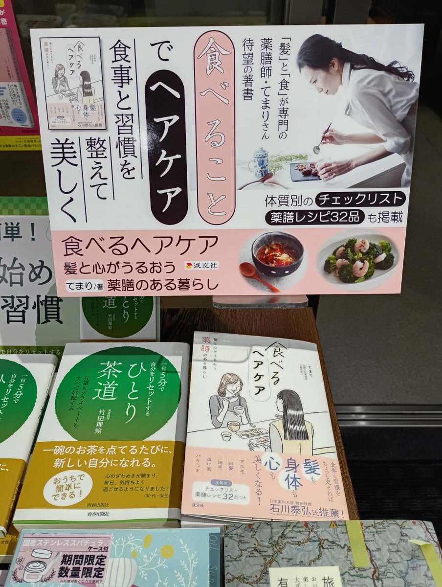 三越前のタロー書房さんで、 『食べるヘアケア』(著:てまり)を店頭入口付近で展開して頂いています! 食事と習慣を整えて髪を美しくする。目からウロコの情報が盛り沢山。 役に立つ「体質別チェックリスト」と「薬膳レシピ」。ぜひ手に取ってみてください。 #淡交社 #薬膳 #ヘアケア pic.x.com/Xpo5FqGl2W