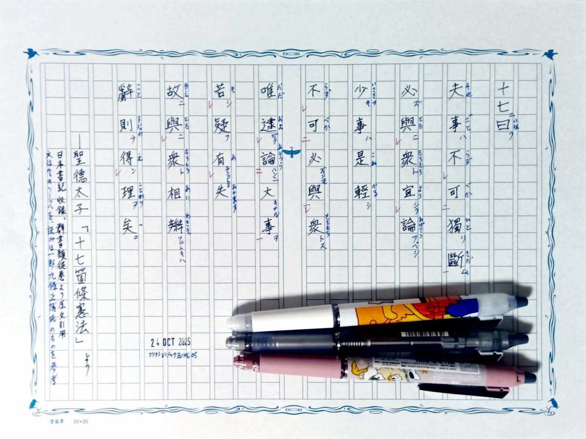 日付が変わって夜も明けての今日の一日一書。昨日分w 高市総理大臣の所信表明演説の〆が十七条憲法だったというので、その該当箇所を探し、原文や読み方を調べて夜が明けてしまった🥴 中途半端かもしれないが、返点つきで出しときます。 #深夜の自主書写もどき30分一本勝負 #飾り原稿用紙ユーザー会 pic.x.com/QadDqq3rrA
