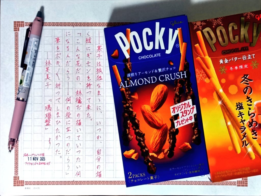 ポッキーの日でもあった今日の一日一書・2書目。 青空文庫からパリを舞台にした林芙美子の作品を自主ゆる書写。 流行りに乗ってポッキー買ってきたが、さすがにセブンのプレゼントチャームは在庫終了。 #深夜の自主書写もどき30分一本勝負 #飾り原稿用紙ユーザー会 pic.x.com/4MWrnSn07T