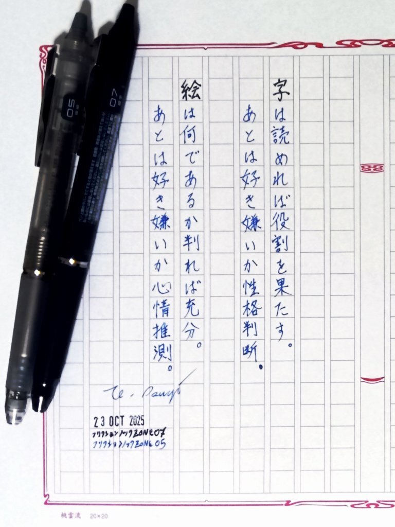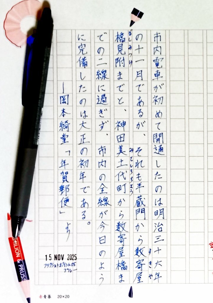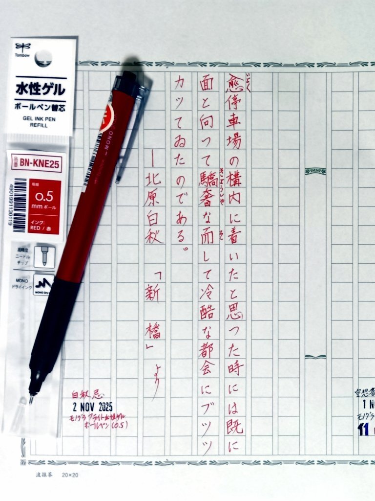 日付が変わってしまったが今日の一日一書・〆。 #白秋忌 でもあったので、北原白秋の随筆『新橋』の一部を青空文庫よより自主ゆる書写。 モノグラフライト(油性)の赤が出なくなってたので、水性ゲルインクのリフィルを入れて試し書き。 #深夜の自主書写もどき30分一本勝負 #飾り原稿用紙ユーザー会 pic.x.com/M4PFqaEKkZ