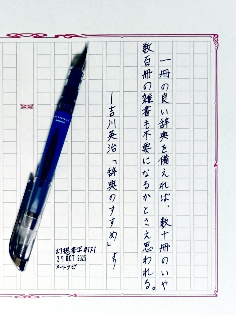 日付が変わって夜明け前の今日の一日一書。 #幻想書写 のお題を拝借。 辞書、楽しいですね。私は言葉の使い方に厳しい「明鏡」を愛用してますが、できれば質実剛健な「岩波」、新語に強い「三省堂」と3冊揃えておきたいくらいです。 #深夜の自主書写もどき30分一本勝負 x.com/genso_shosha/s… pic.x.com/zOrIEX8vAw