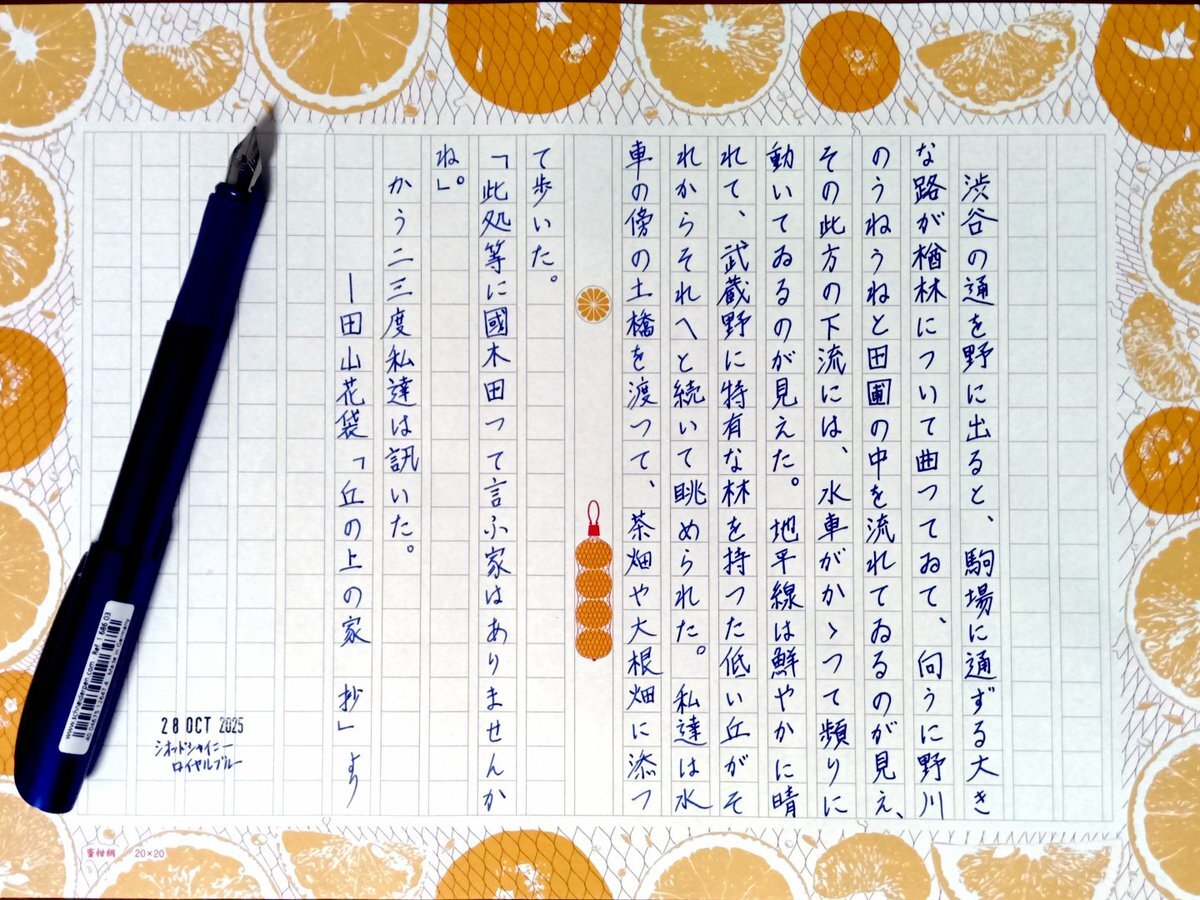 今日の一日一書・2書目。 夕方の続編。 NHK_R1『高橋源一郎の飛ぶ教室』の“はじまりのことば”で、田山花袋と国木田独歩の出会いについて語っていたが、そこで引用された花袋の作品箇所の一部を自主ゆる書写。 #深夜の自主書写もどき30分一本勝負 #飾り原稿用紙ユーザー会 pic.x.com/fz4I5UNFQv