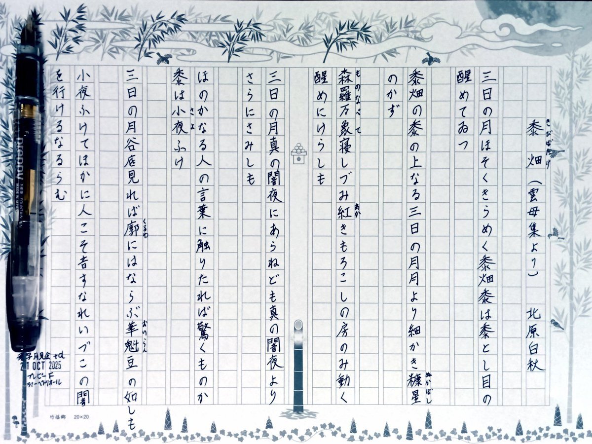 今日の一日一書・4書目。 #書写月見会 も重なり、プラスαでお題を拝借。 全文書けると思ったら行数数え間違えてレイアウト変えて詰め込む始末🫣 「月が綺麗ですね」 「あなたAIみたいに嘘つきね。今日は新月」 AIも月齢間違って出てる。 #深夜の自主書写もどき30分一本勝負 #飾り原稿用紙ユーザー会 pic.x.com/KW7i8V1nIh