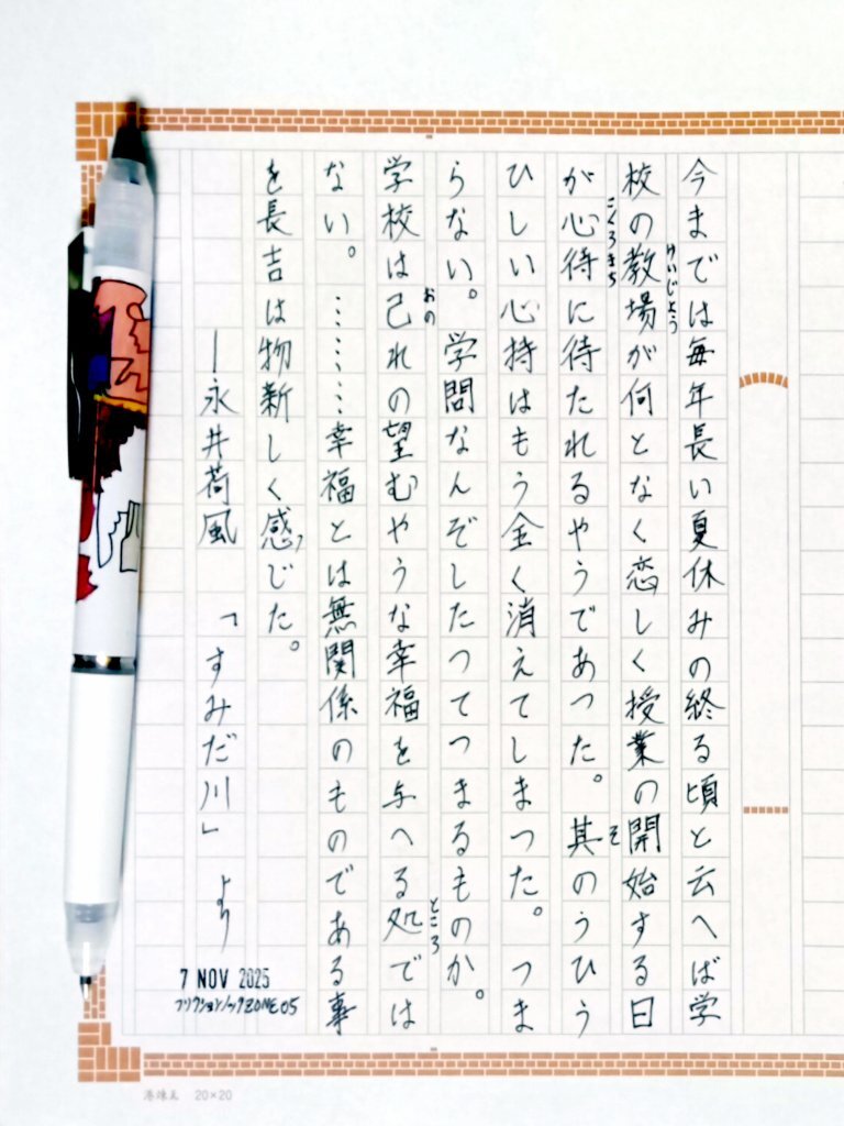 今日の一日一書・2書目。 永井荷風の『すみだ川』読了。 今まで荷風作品は読んだことなかったが、一文一文の高尚な単語の組合せが美しい(知らなかった名詞も多いがw)。 学歴信仰はこの時代から始まっていたのか…そこで自主ゆる書写。 #深夜の自主書写もどき30分一本勝負 #飾り原稿用紙ユーザー会 pic.x.com/K92y01Rw3F