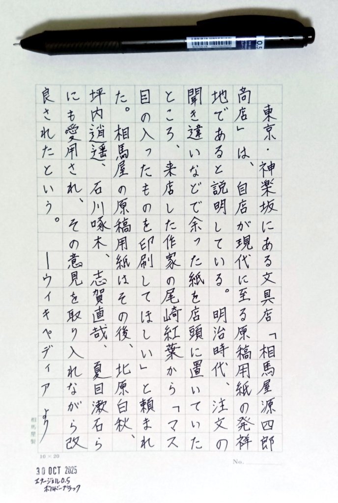 今日の一日一書。 #紅葉忌 だったので、原稿用紙発祥説のひとつである、尾崎紅葉が相馬屋に原稿用紙を発注した経緯をウィキペディアから自主ゆる書写。 #深夜の自主書写もどき30分一本勝負 #相馬屋製原稿用紙 pic.x.com/Ih0OPRKBVc