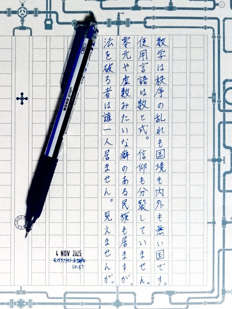 今日の一日一書・2書目。 ちょっとした妄想。数の擬人化同人誌とかはとっくに出てるんだろうな。 数の世界は不思議です。必ずどこかで繋がっている。 でも自然数以外は人間が作ったといえるんだよな。 #深夜の自主書写もどき30分一本勝負 #飾り原稿用紙ユーザー会 pic.x.com/OiHM2bmGQU