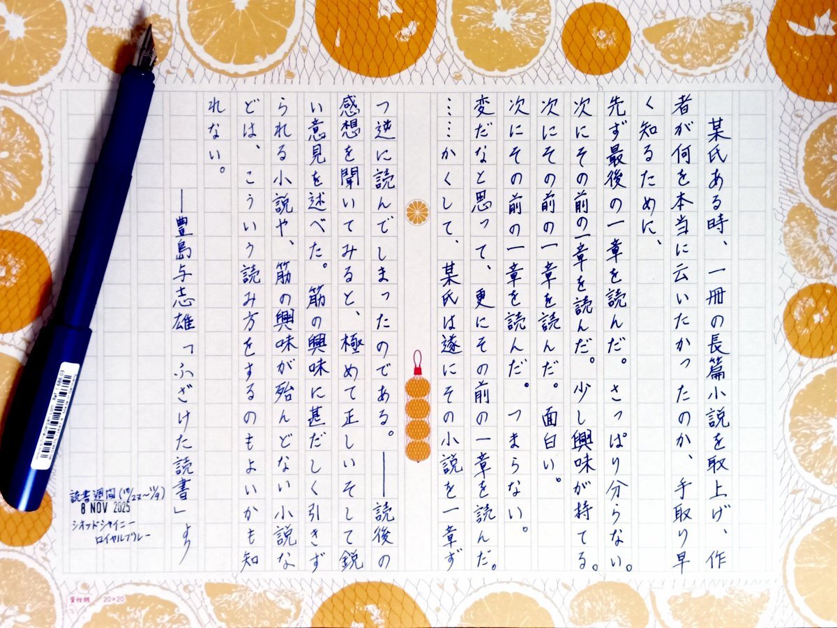 今日の一日一書。 #読書週間 (標語「こころとあたまの、深呼吸。」)が明日で終わります。 そこで読書に関する作品を青空文庫から一部を自主ゆる書写。 ※故意に改行している箇所があります #深夜の自主書写もどき30分一本勝負 #飾り原稿用紙ユーザー会 pic.x.com/r12lsSCUBl