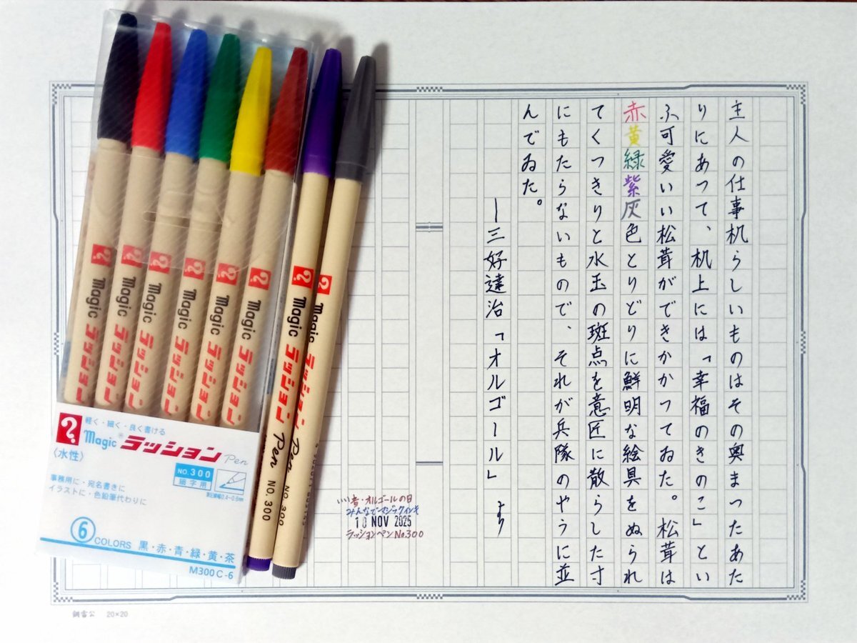 日付が変わって夜も更けて今日の一日一書。 いい音・オルゴールの日と #みんなでマジックインキ の日だったので、それらを合せて青空文庫から自主ゆる書写。 文字は全てマジックラッションペンです。 #深夜の自主書写もどき30分一本勝負 #飾り原稿用紙ユーザー会 pic.x.com/hhRcBNELtg