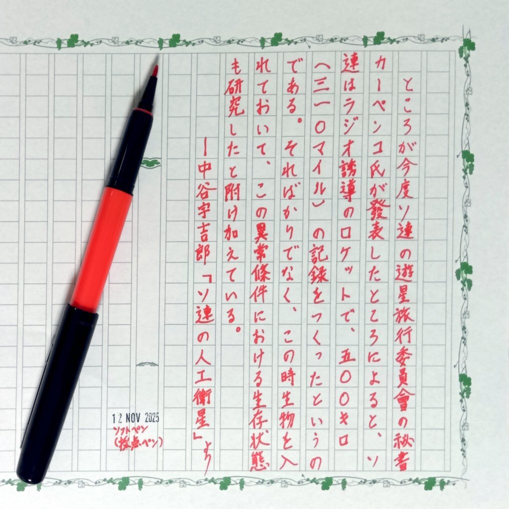 今日の一日一書。 早速手に入れたソフトペン(採点ペン)で自主ゆる書写。 赤の色彩はかなり良い、が画数の多い漢字はチップの太さと染料系インクの性質からつぶれてしまう。 このカートリッジインク、プレピーで使ったらどうなるかな😁 #深夜の自主書写もどき30分一本勝負 #飾り原稿用紙ユーザー会 pic.x.com/EABN5W00rL