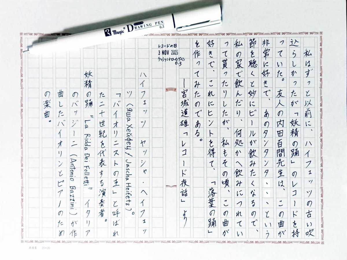 日付が変わって夜明け前の今日の一日一書。 文化の日、文具の日とともにレコードの日だったので、クラシックのSP盤を愛好している宮城道雄の作品を自主ゆる書写。 #みんなでマジックインキ の日だったのでラッションドローイングペンで。 #深夜の自主書写もどき30分一本勝負 #飾り原稿用紙ユーザー会 pic.x.com/hRwMEE62lR