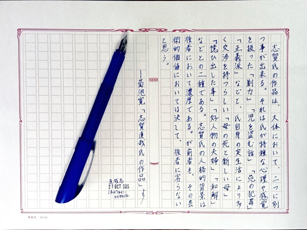 #直哉忌 でもある今日の一日一書・3書目。 志賀直哉の作品は保護期間が切れてないので、期間が切れてる作家が書いた志賀直哉についての箇所を自主ゆる書写。 #深夜の自主書写もどき30分一本勝負 #飾り原稿用紙ユーザー会 pic.x.com/nfpizQAPMg