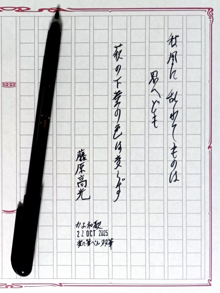 日付が変わって夜明け前の今日の一日一書。 前日は書きすぎたので本日(自然界的には昨日w)は #かよ和歌 のみで。 それにしても癖が強過ぎる続け字だ🤣 #深夜の自主書写もどき30分一本勝負 #飾り原稿用紙ユーザー会 pic.x.com/nDY5ipZRMK