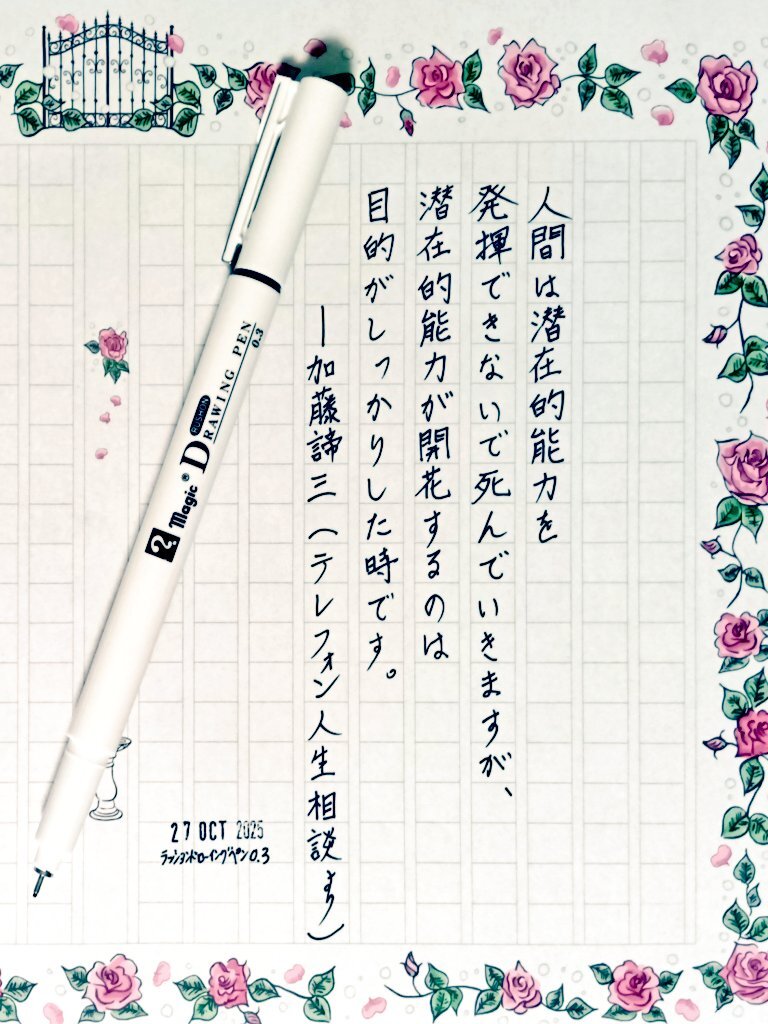 日付が変わって夜も更けて今日の一日一書。 テレフォン人生相談の加藤諦三先生の最後の一言が一部で話題にのぼって、私も名言としてシタタメておきたくなった。 #みんなでマジックインキ の日だったので、ラッションドローイングペンで。 #深夜の自主書写もどき30分一本勝負 #飾り原稿用紙ユーザー会 pic.x.com/PsJUmH8hlz