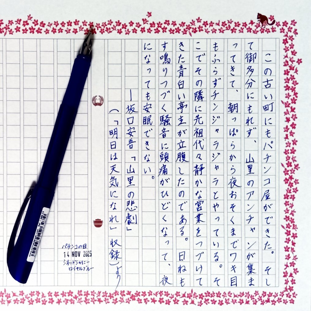 今日の一日一書・2書目。 #パチンコの日 でもあったので青空文庫からパチンコ文化を表す作品を、坂口安吾の短編連載集から見つけたのでそれを自主ゆる書写。 昔は玉を1個ずつ穴から入れて、全て手でレバーを一回一回をはじくものだった。 #深夜の自主書写もどき30分一本勝負 #飾り原稿用紙ユーザー会 pic.x.com/6Nxjw7gQdj