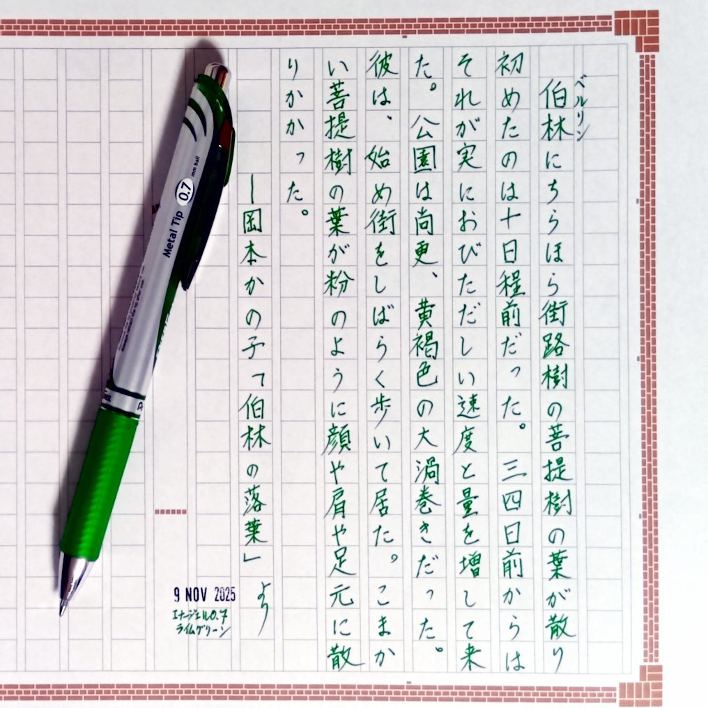 今日の一日一書。 ベルリンの壁崩壊の日だったので、ベルリンの秋を舞台にした小説を青空文庫から自主ゆる書写。 ただ青空文庫収録作品はベルリンの壁建設前のもの(建設以降の作品は著作権が消失していないものがほとんど)。 #深夜の自主書写もどき30分一本勝負 #飾り原稿用紙ユーザー会 pic.x.com/ccghZvuGSP