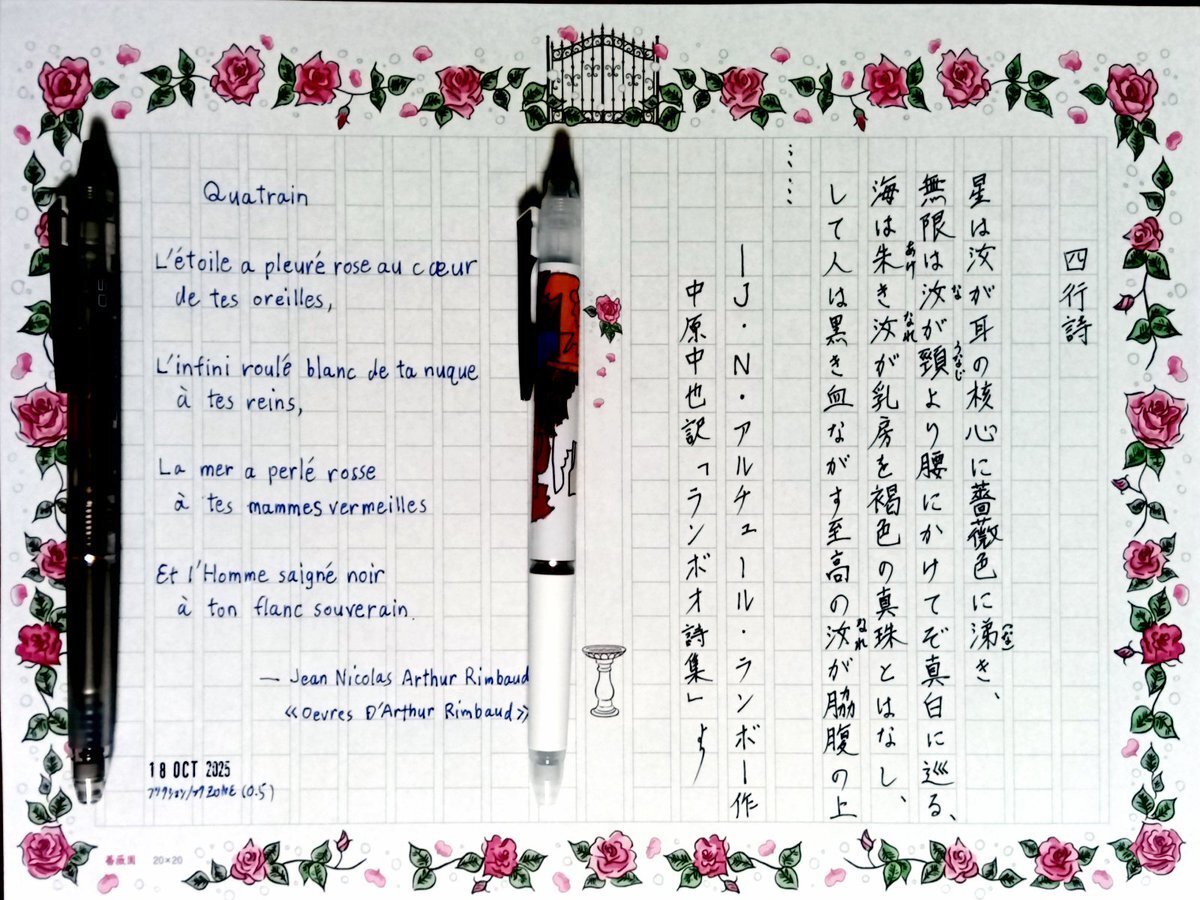 日付が変わって夜も更けて今日の一日一書。 昨日、四行詩というタイトルの話題が出たので、題が「四行詩」とついているランボオの仏文詩を、中原中也訳で自主ゆる書写。 実はこのオリジナル詩もタイトルがなく、家族の人が便宜的に « Quatrain » とつけた模様。 #深夜の自主書写もどき30分一本勝負 pic.x.com/vM0sXuooKI
