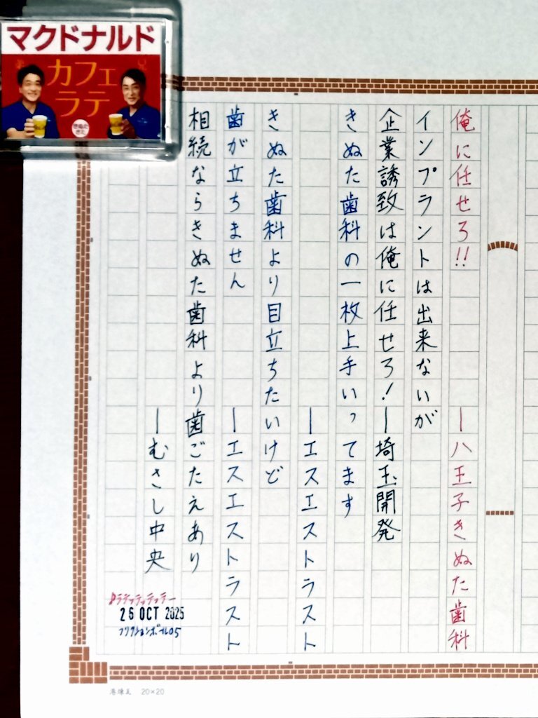 今日の一日一書。 顔出し看板で有名な #きぬた歯科 さんの、マクドナルドさんとのコラボによる世界進出を記念して、これまで、きぬた看板とコラボまたは挑戦してきた企業の看板コピーをいくつか書いてみた。 #深夜の自主書写もどき30分一本勝負 #飾り原稿用紙ユーザー会 pic.x.com/YrzfXpS7NS