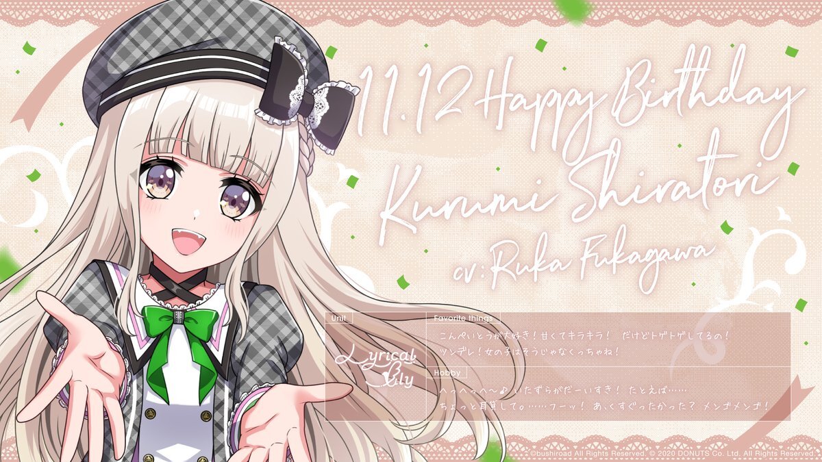 🎉🎂#白鳥胡桃 Happy Birthday🎁✨ 本日11月12日は白鳥胡桃(CV. #深川瑠華)の誕生日です❢ おめでとうございます🎊 胡桃からのコメントもチェック👀✨ ぜひ一緒にお祝いしてくださいね👏 #D4DJ #グルミク #リリリリ🌸 #白鳥胡桃生誕祭2022 pic.x.com/nHRS2pPI5w