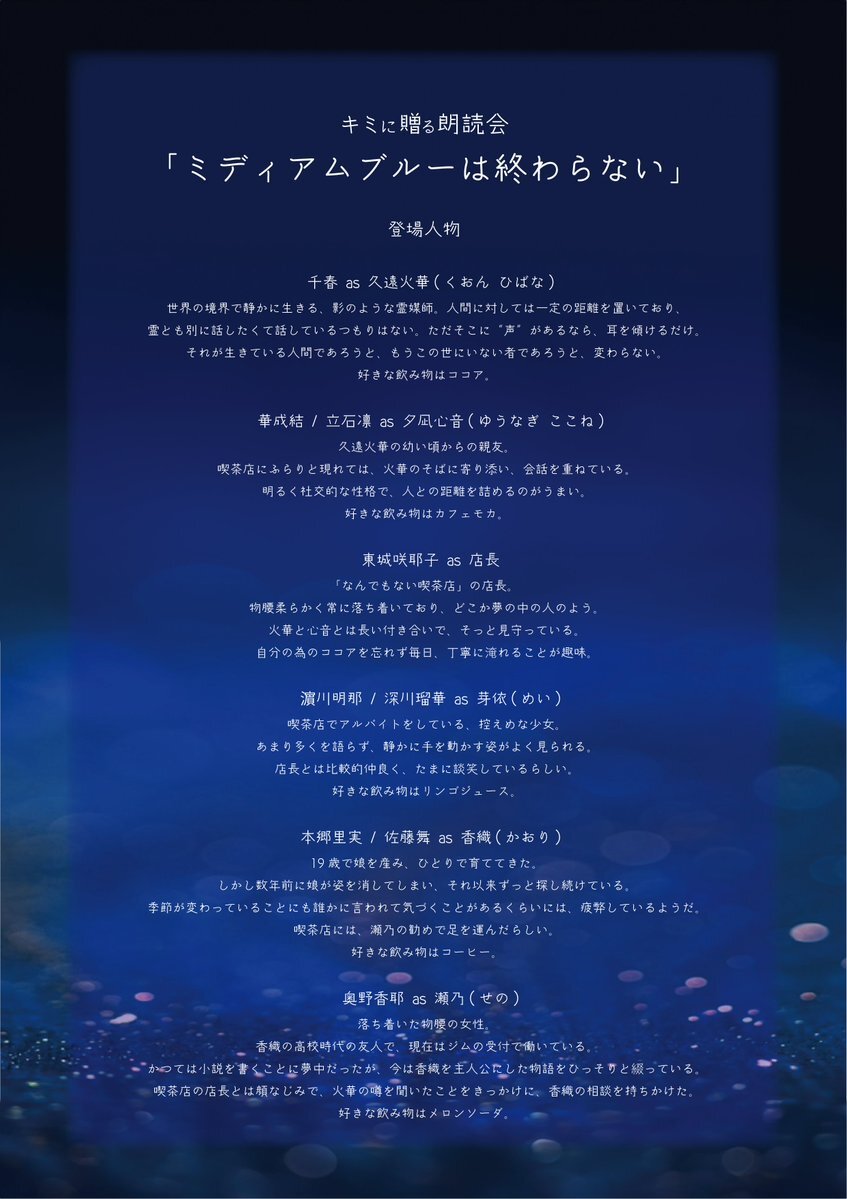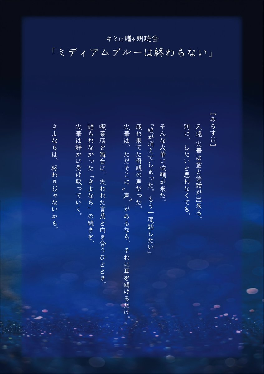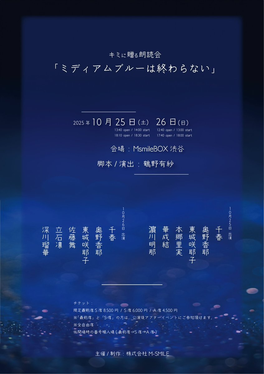 おはようございます! #キミに贈る朗読会 【ミディアムブルーは終わらない】 本日最終日! 2公演開催です📘 両部共、若干数当日券のご用意がございます✨ 1部LIVE配信あり📡 premier.twitcasting.tv/msmile_info/sh… 出演🗣️ #奥野香耶 #東城咲耶子 #佐藤舞 #立石凛 #深川瑠華 #鶴野有紗 #朗読ミディブル pic.x.com/I4rJ6lLhz5