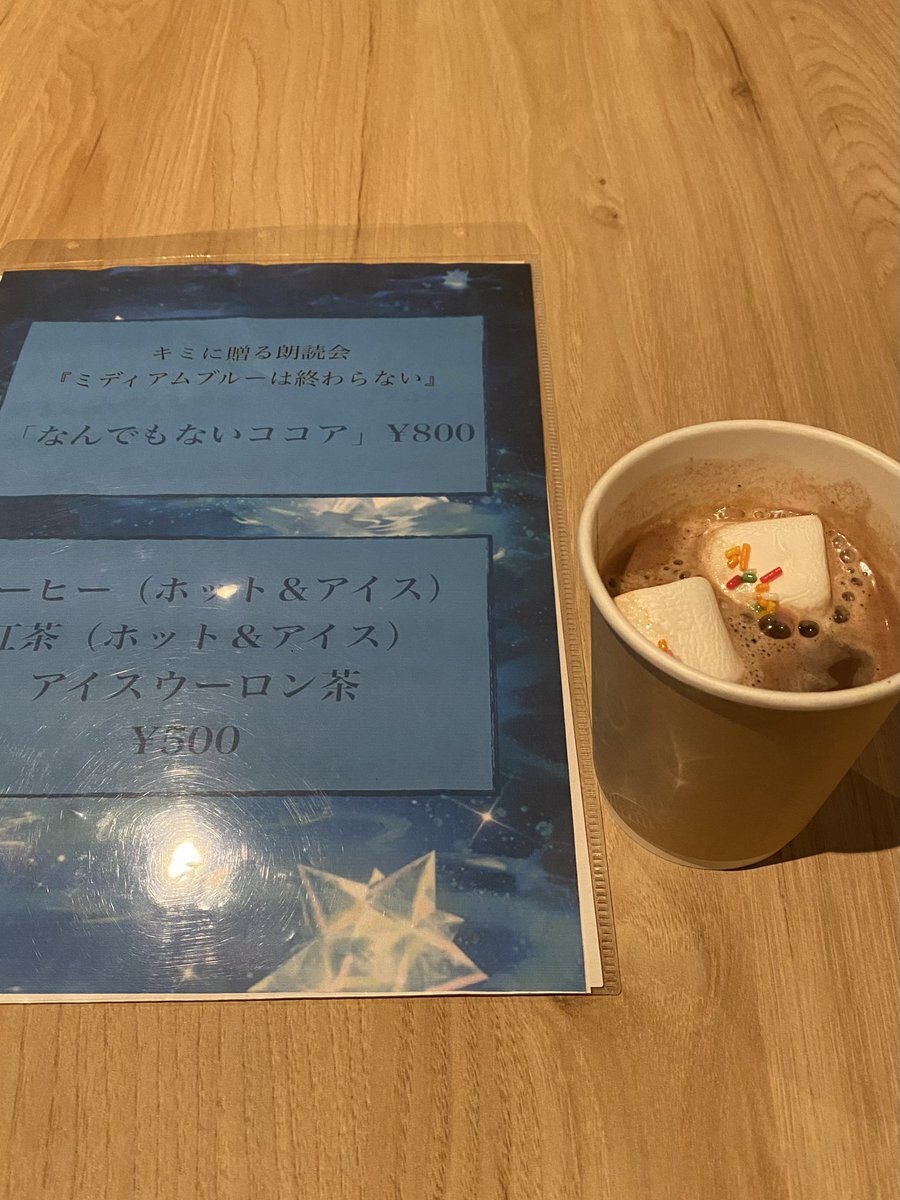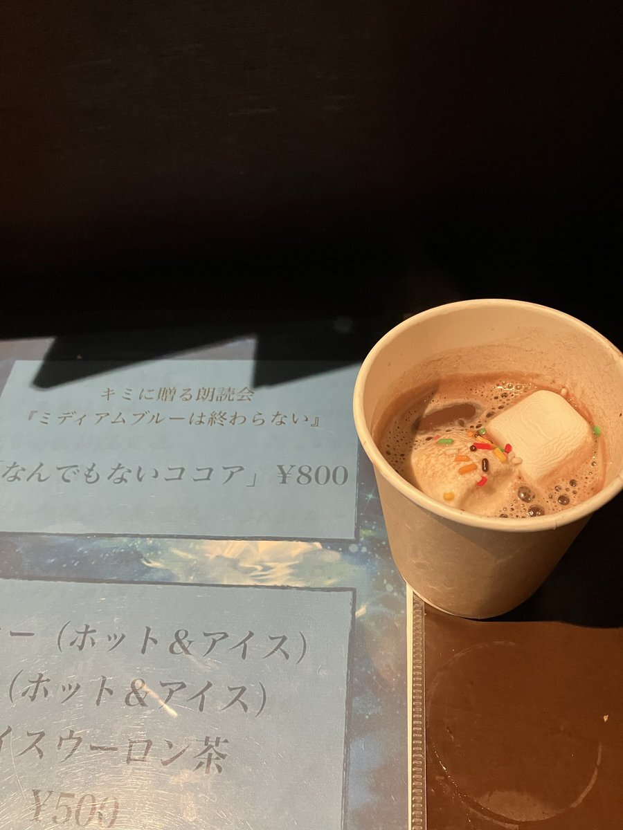 そこそこ共感できる内容のお話だったのでいろいろ思い出しながら観ておりました。 僕も「なんでもない喫茶店」に行きたいなぁ… ココア、マシュマロ入ってて美味しかった☕️😋 ソワレも観に行きます! #朗読ミディブル #キミに贈る朗読会 #深川瑠華 pic.x.com/3MBis03v2a