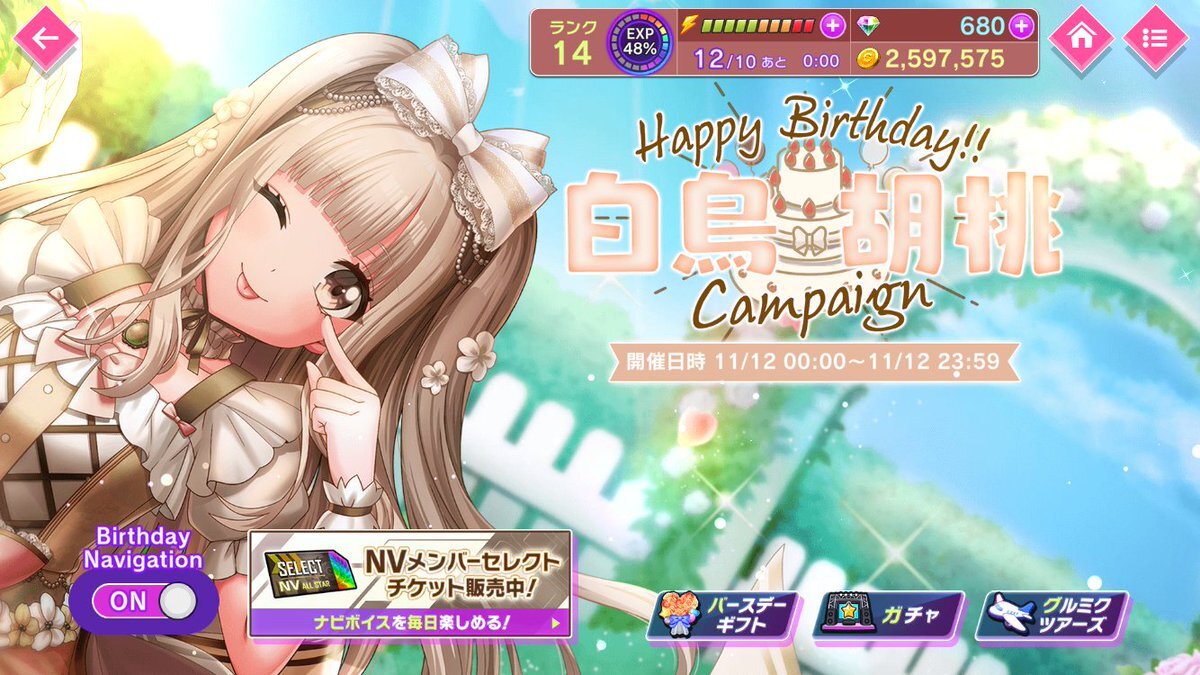 🎉11月12日 Happy Birthday 胡桃🎂 本日限定で NV[Navigation:With]白鳥胡桃のナビゲーション機能が体験できます! お誕生日ページから「Birthday Navigation」をON🔛にして体験してくださいね🎤✨ #D4DJ #グルミク