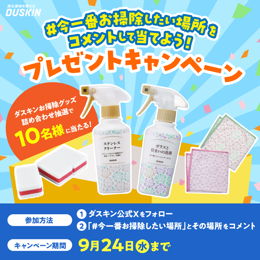 / 今一番お掃除したい場所を教えて! #プレゼントキャンペーン \ 今月は #清掃の日 のあるお掃除月間🧹 みなさんが今一番お掃除したい場所はどこか是非聞かせてください✨ ▼応募方法 ① このアカウントをフォロー ② #今一番お掃除したい場所 とその場所をコメント 締切:9/24(水)まで pic.x.com/b9feVgaV3O