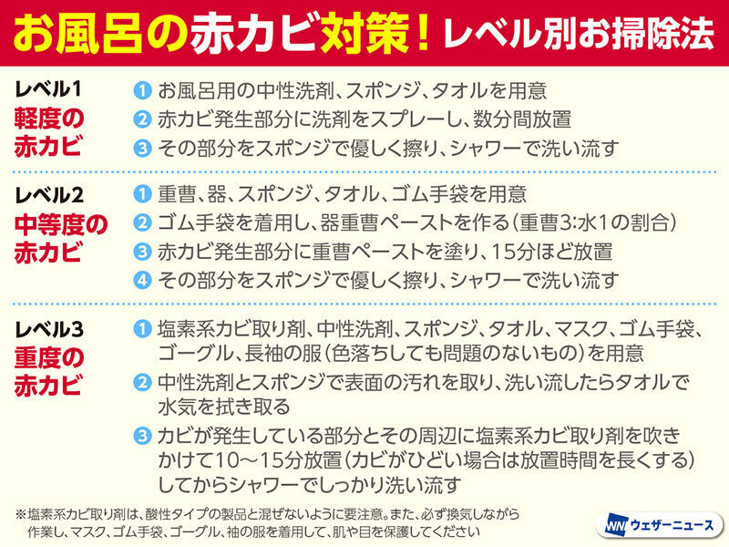 <お風呂場のピンク汚れ対策> 湿度が高いカビの季節が続きます。お風呂場のピンク汚れの正体は皮脂や垢を栄養源とする赤カビ。放置すると黒カビの発生に繋がり、早めの対処が重要です。 今日9月24日は #清掃の日 。お風呂の赤カビ対策を行なってみるのはいかがですか。 weathernews.jp/news/202509/22… pic.x.com/17PbFxoImK