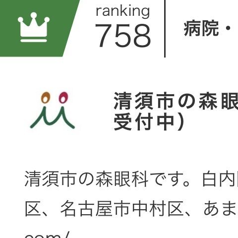 こんばんは。清須市の眼科、森眼科です。森眼科のある清須市は名古屋市のすぐお隣です。名古屋では「・758」ってナンバープレートの車を見かけます。細々とアメブロをしているのですが、病院・クリニック部門で森眼科758位でした。うれしくなってスクショを撮りました♪ #清須市 #眼科 #清須へおいでよ pic.x.com/hjZoeNhzAl