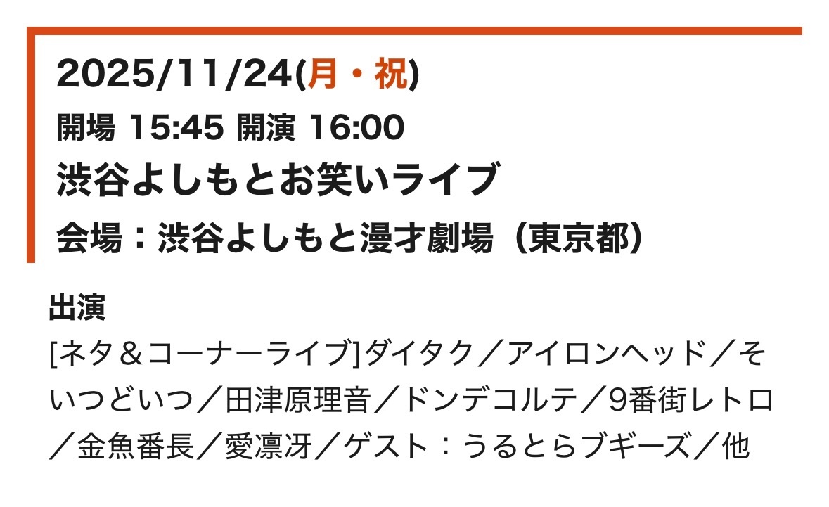 【出演情報🆕】 11/24(月) ▶︎16:00-17:30 渋谷よしもとお笑いライブ #渋谷よしもと漫才劇場 🎫前売3,000円/当日3,300円 ticket.fany.lol/reception/2445… 〈出演〉 ダイタク/アイロンヘッド/そいつどいつ/田津原理音/ドンデコルテ/9番街レトロ/金魚番長/愛凛冴/うるとらブギーズ/他 pic.x.com/HpnK8C7ofN
