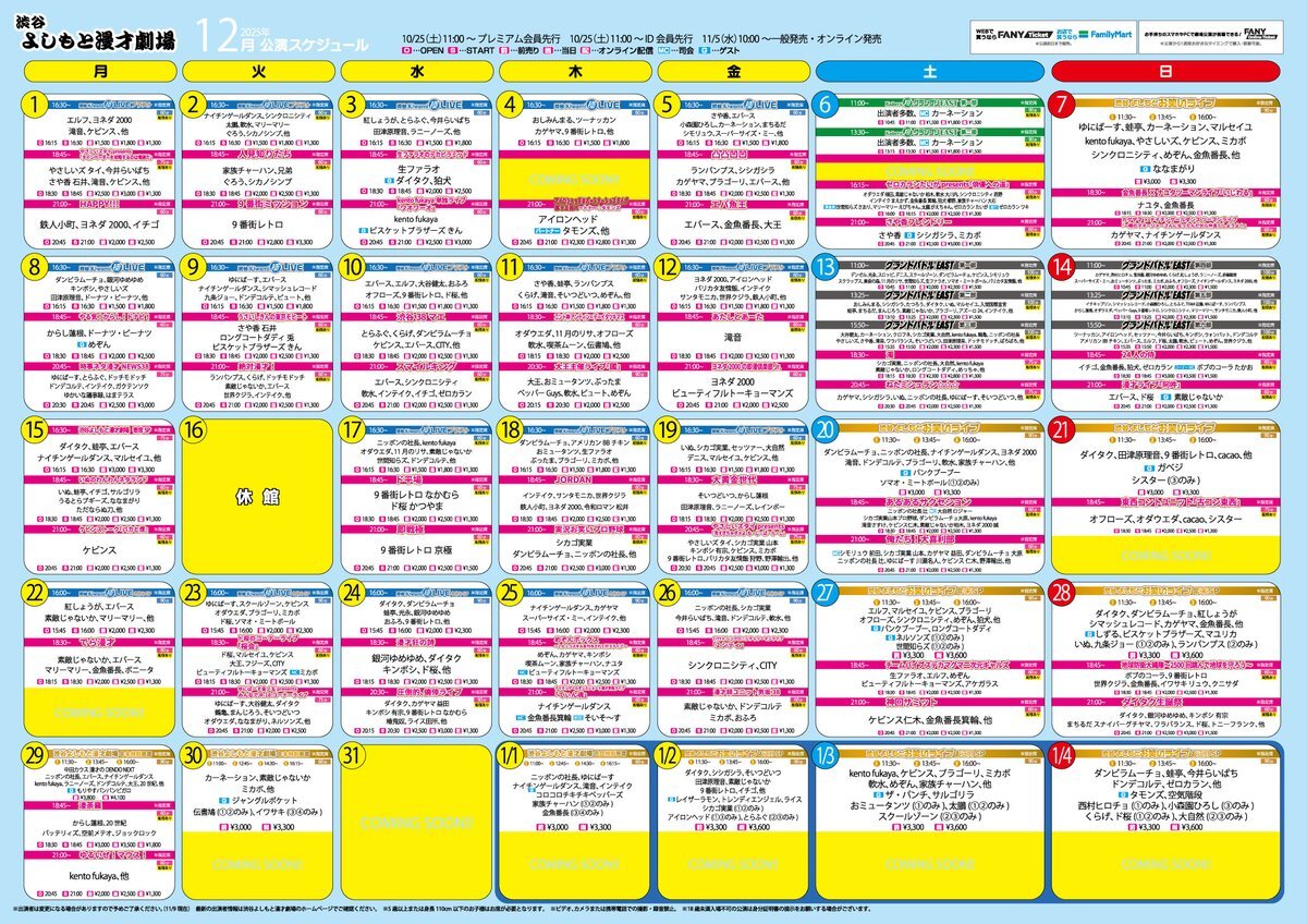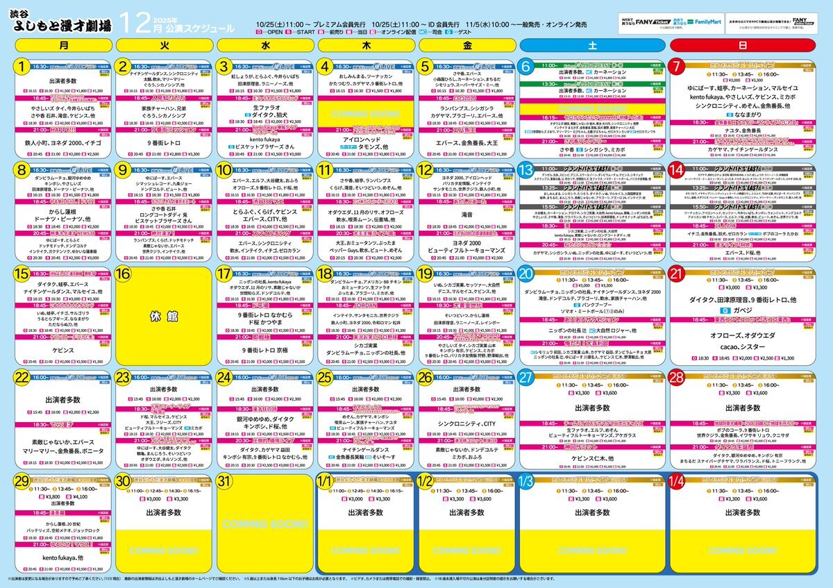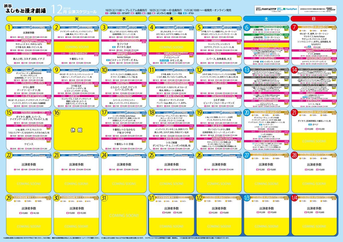 \🎄 2025年12月公演スケジュール公開🎅/ #渋谷よしもと漫才劇場 《🎫発売スケジュール》 ◎プレミアム・ID先行 10/25(土)11:00~10/28(火)11:00 ○一般・配信:11/5(水)10:00 ※一部販売スケジュールが異なる公演がございます 12月公演の先行受付はこちらをご確認ください👀 pic.x.com/1ENh8ELGlE