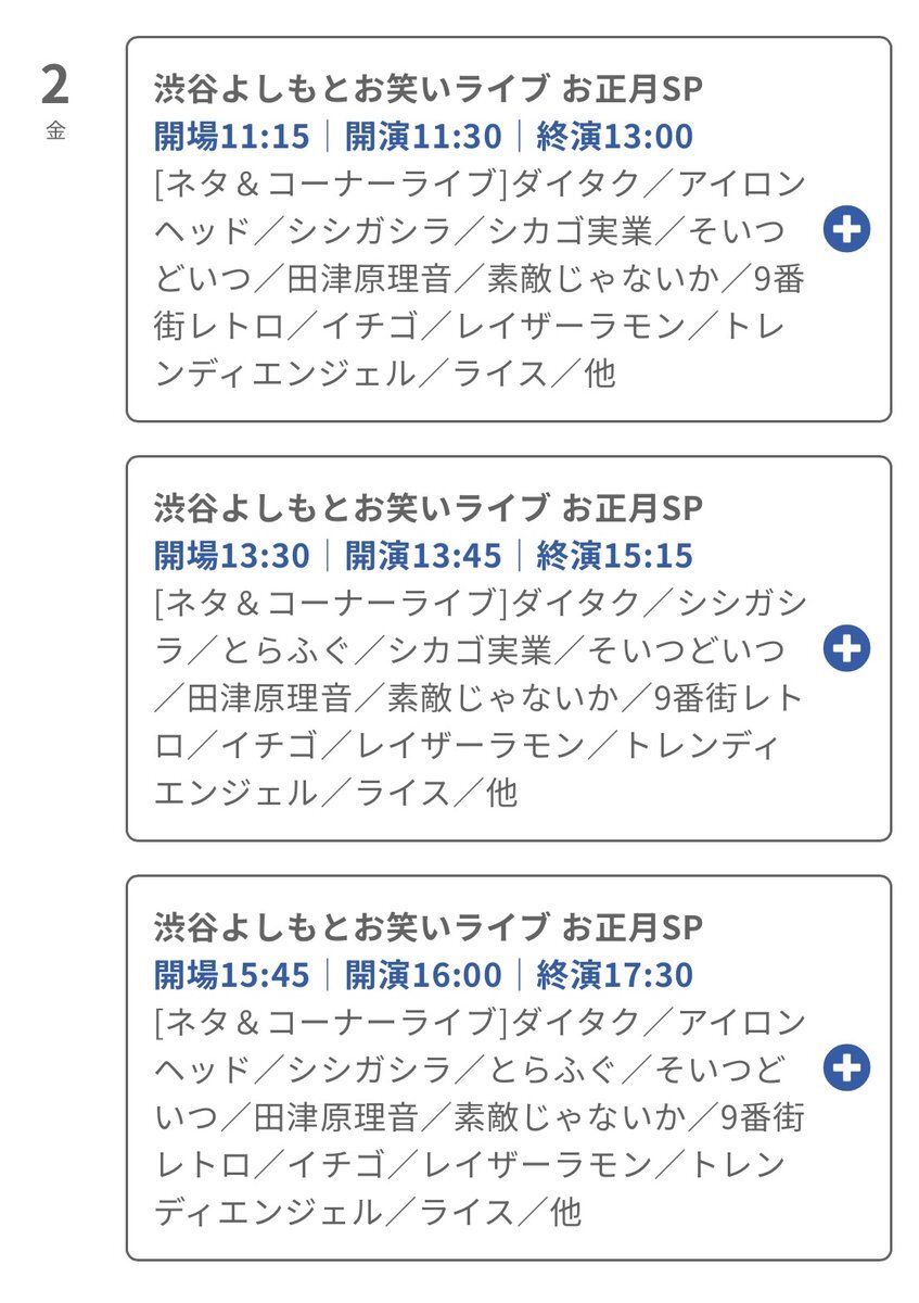 【出演情報🆕】 1/2(金) ▶︎11:30-13:00/13:45-15:15/16:00-17:30 渋谷よしもとお笑いライブ お正月SP #渋谷よしもと漫才劇場 🎫前売3,300円/当日3,600円 ticket.fany.lol/reception/2881… ticket.fany.lol/reception/2881… ticket.fany.lol/reception/2881… pic.x.com/BkGmOeAAsH