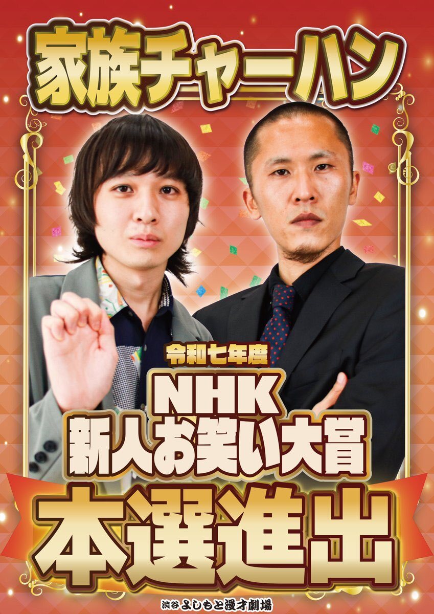 いよいよ本日『令和7年度NHK新人お笑い大賞』です👑 渋谷・神保町よしもと漫才劇場メンバーからは、 #ヨネダ2000 #家族チャーハン が出場します‼️ NHK総合で16時~生放送📺 出番前の家族チャーハンの写真が届きました🍥 応援の程、よろしくお願いします✨ #NHK新人お笑い大賞 #渋谷よしもと漫才劇場 pic.x.com/3PksrDyd6m