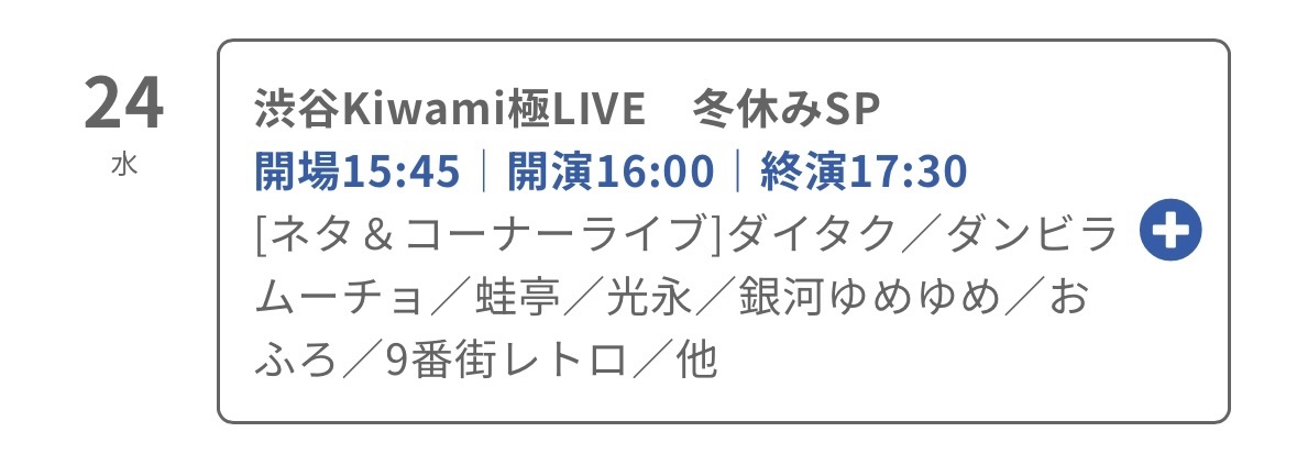 【出演情報🆕】 12/24(水) ▶︎16:00-17:30 渋谷Kiwami極LIVE 冬休みSP #渋谷よしもと漫才劇場 🎫前売2,000円/当日2,300円 ticket.fany.lol/reception/2707… 〈出演〉 ダイタク/ダンビラムーチョ/蛙亭/光永/銀河ゆめゆめ/おふろ/9番街レトロ/他 pic.x.com/sUsGCcSzFK