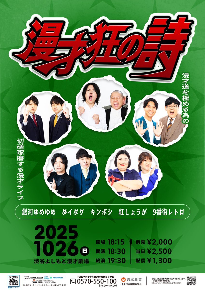 【明日10/25のご出演④👁🗨】 ▶︎18:30-19:30 漫才狂の詩 #渋谷よしもと漫才劇場 🎫前売2,000円/当日2,500円 ticket.fany.lol/reception/2055… 🎈配信1,300円 online-ticket.yoshimoto.co.jp/products/%E6%B… pic.x.com/jGHH9RIycr