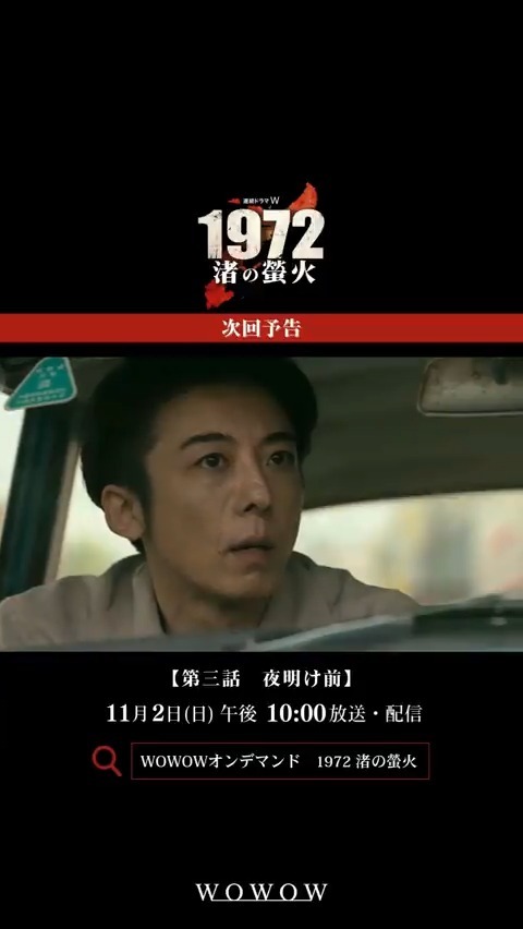 『連続ドラマW 1972 渚の螢火』 第二話ご視聴ありがとうございました❗️ 【第三話 夜明け前】 11/2(日)午後10:00~放送・配信🔥 #1972渚の螢火 で感想&考察をお待ちしています📝 WOWOWオンデマンドで1~2話まで配信中 wod.wowow.co.jp/program/202451… 次回予告はこちら⬇️ #高橋一生