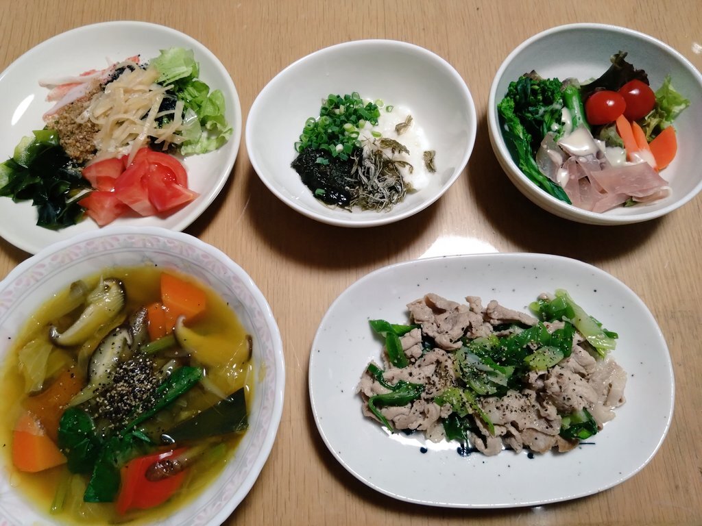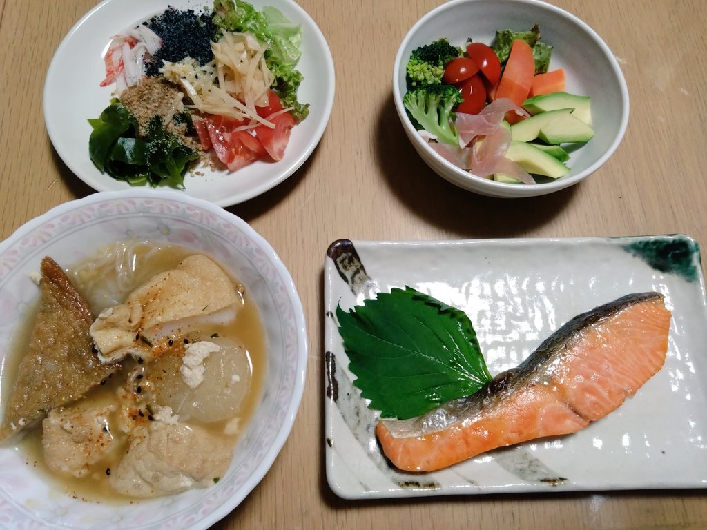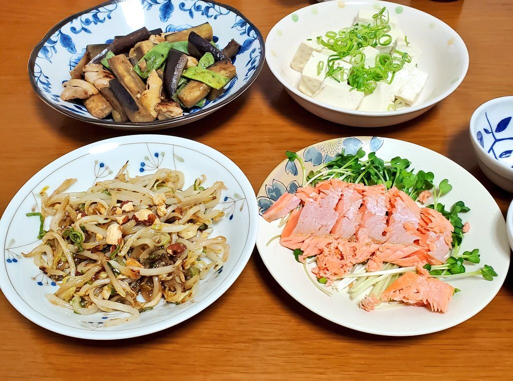 11/9 晩 減塩 ごはん 鶏の茄子とインゲン炒め 1.0g 炒めもやしのナッツあえ 1.0g 蒸し豆腐(ポン酢で) サーモンのタタキ(わさび醤油で) 美味しくて満足😊 ごちそうさまでした!😋 正確な数字は出せないのですが、私の食べた塩分は2g以内で収まっているはずです(^_^;) #減塩 #おうちごはん pic.x.com/tmiLa66rKp
