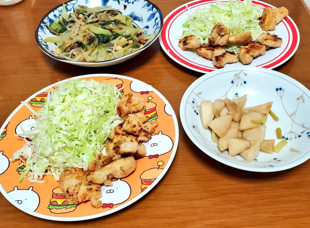 11/11 減塩 晩 ごはん 大麦ごはん 鶏胸の唐揚げ 0.5g(1皿) 白菜もやしナッツ炒め 2.0g もやしナッツ炒め 0.9g カブの酢煮 0.3g 塩分摂取 1.9g 唐揚げは美味い😊 味付けした鶏肉に片栗粉つけて、オイルスプレーかけて高温で焼いただけですが、ザクザクでした😋 #減塩 #おうちごはん pic.x.com/arV3OCUHUl
