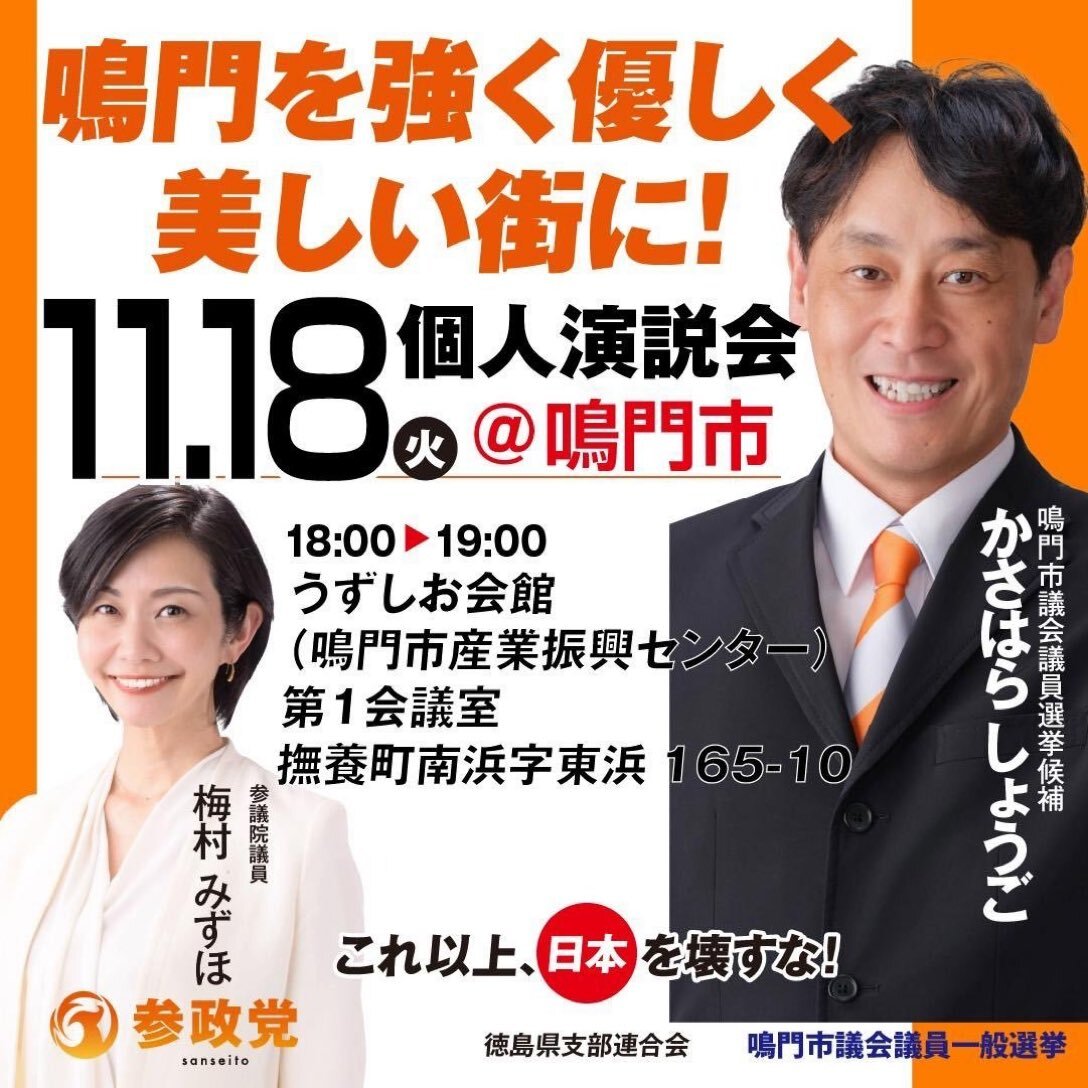 徳島県 鳴門市の皆様💕 【参政党🧡かさはら しょうご】 鳴戸市議会議員選挙 11月23(日) 投票日 日本🇯🇵鳴門市を守り抜きます。 【参政党🧡かさはら しょうご】 #参政党は消費税全部なし #減税・国民負担率35パーセント以下に・インボイス廃止 #0〜15歳まで子供一人あたり月10万円支給 x.com/55149yya/statu…