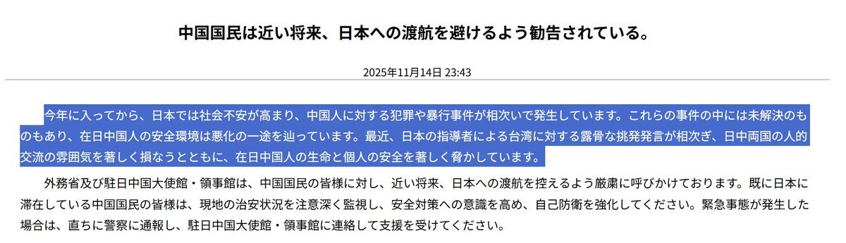 【発表】中国、日本への渡航を控えるよう注意喚起 news.livedoor.com/article/detail… 中国外務省は「最近、日本の指導者が公然と台湾問題で挑発的発言を行い、日本に滞在する中国人に重大なリスクをもたらしている」などと説明している。今後中国から日本への観光など人的交流に影響が出る可能性がある。