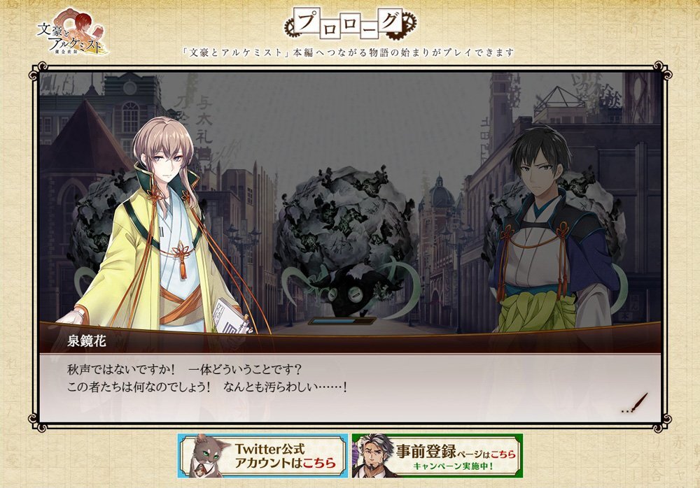 【プロローグ紹介】 徳田秋声(CV渡辺拓海)や泉鏡花(CV神谷浩史)の声、壮大なBGMが楽しめる 「文豪とアルケミスト」プロローグをPCでプレイできます。 ぜひこの機会にお楽しみください! bit.ly/2em8vCt #文アル #渡辺拓海 #神谷浩史 pic.x.com/MZvEvZxc8H