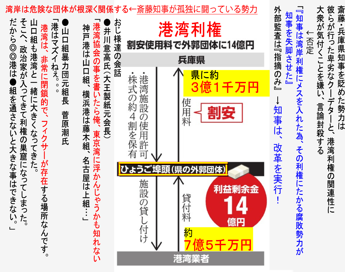 港湾利権。ひょうご埠頭株式会社の社長や専務は県のOB。2005年から八代に渡り社長は県のOB。3億円でレンタルして他の港湾事業者に7億円で又貸し。しかも施設の修繕費などは県持ち。これを切ろうとしたから嵌められた。 #兵庫県知事がんばれ #さいとう元彦 #港湾利権 pic.x.com/iPp2AvlVUC x.com/motohikosaitoH…