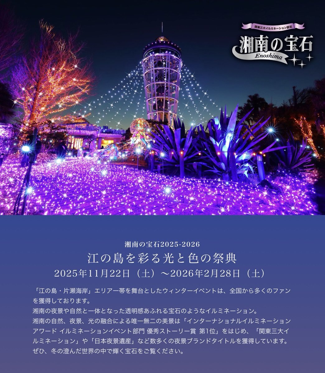 きたー!✨ 冬の #湘南 を彩る絶景イルミ「#湘南の宝石」が11/22から開催決定!💎 「関東三大イルミネーション」「日本夜景遺産」の称号を持つ、まさに光と色の祭典!🎉 #江の島 の夜景や自然と一体になった透明感あふれる輝きは感動必須です! enoshima-seacandle.com/event/shonanno…