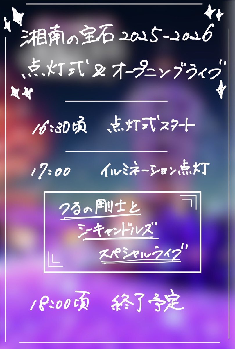 明日です!! 江の島サムエルコッキング苑内、シーキャンドル下のステージにて💎🎤 今年もつるの剛士さん率いる、つるの剛士とシーキャンドルズの皆さんが会場を盛り上げてくださいます🎶 ざっくりタイムスケジュールは⬇️ 手書きw #湘南の宝石 #江の島 #藤沢 #イルミネーション #点灯式 pic.x.com/deiI8mhgzP x.com/takayasu_ohya/…